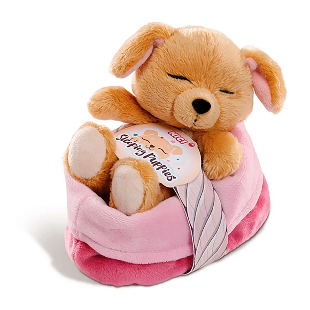 The Cute Little Dog Puppy Made Of Super Soft Plush Sleeps Snuggled In His Plush Basket. The Dog Bed Is In The Colors Pink And Purple And Serves The Little Rascal As Product Packaging And Home. The Sleeping Dog Puppy With The Embroidered Eyes Of Nici Is In A Beautiful Caramel Tone And The Perfect Cuddly Toy.